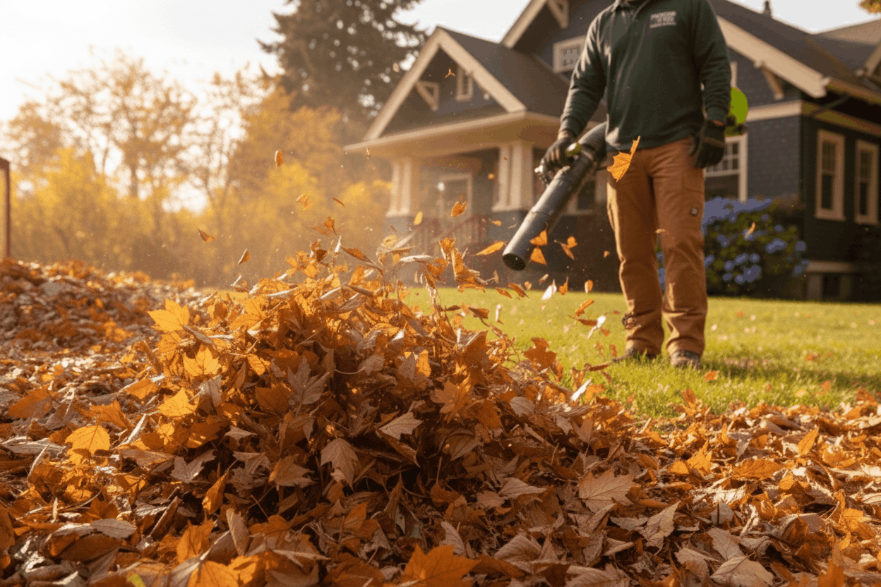 Efficient leaf clearing using professional equipment to keep your yard tidy and prevent lawn damage.